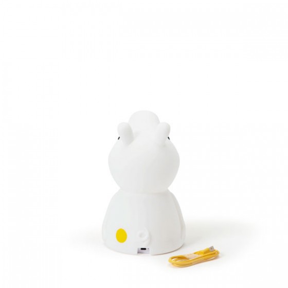 充電時將USB線,直接連接到佩佩豬後方的USB插座上,當產品背面的紅色指示燈亮起時,產品正在充電。出於安全考量,充電過程中燈光功能將無法使用。按下開關來開燈。使用燈泡底部的調光器調節至所需的亮度。最低設置是夜間模式。充滿電的時間為6小時,可使用8~100小時(取決於所選擇的燈光強度)。