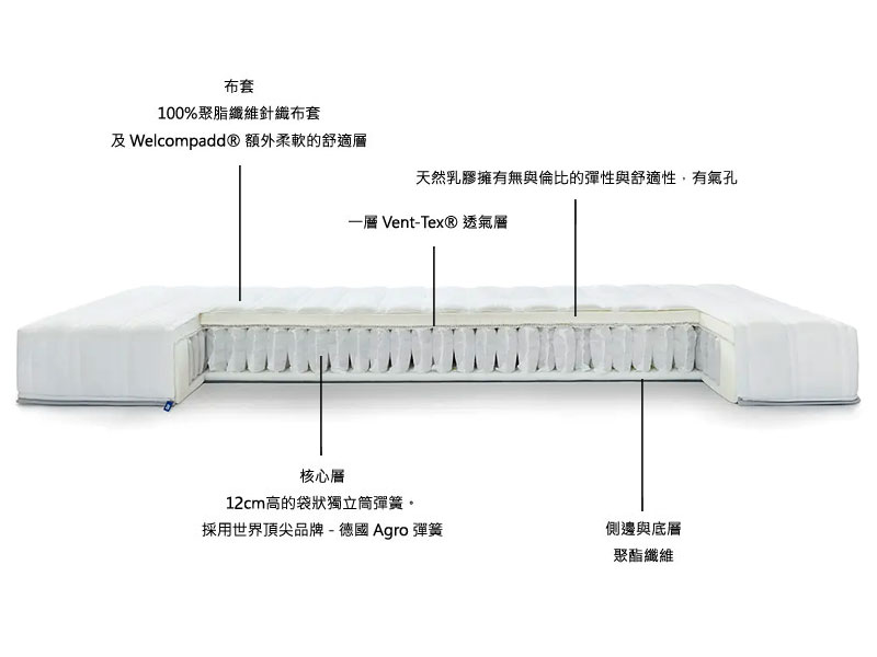 床墊內的彈簧使用德國Agro獨立筒彈簧,這是世界頂尖彈簧品牌。彈簧使用特殊回火技術製造,彈簧一體成型,卓越的震動能量吸收與釋放能使人體每個部位得和最佳貼合面,彈簧不塌陷。並將彈簧分別放置在獨立的布袋中製成的。這意味著每個彈簧都能夠獨立運作,不受周圍彈簧的影響。這種設計使彈簧能夠根據身體的不同部位提供個別的支撐和壓力分散效果,提高睡眠的舒適度。