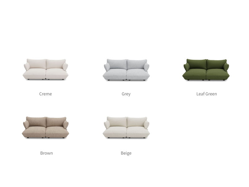 您可以依空間大小與使用需求自由搭配: 單人座 Sumo Seat 、有扶手的 Sumo Love Seat 、轉角座位 Sumo Corner Seat 、無靠背的座位腳凳 Sumo Hocker 、雙人沙發 Sumo Sofa Medium 、三人沙發 Sumo Sofa Grand、到多人沙發組合 Sumo Corner Sofa 。