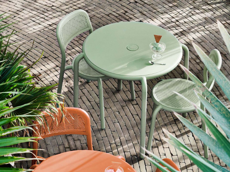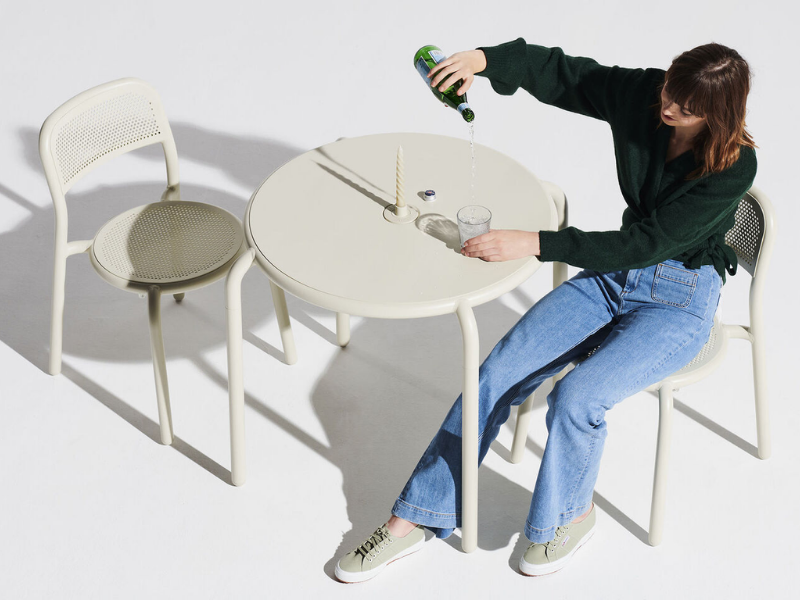 Toni Bistreau桌子最多可容納四人一同使用,其中桌面中間的孔洞在白天時可以配合傘架、晚上還可以變成燭台使用