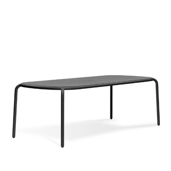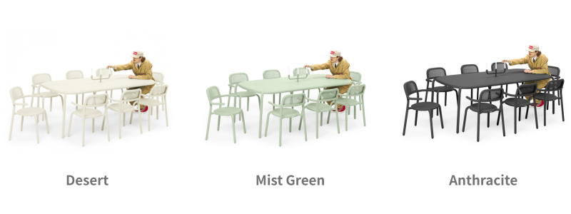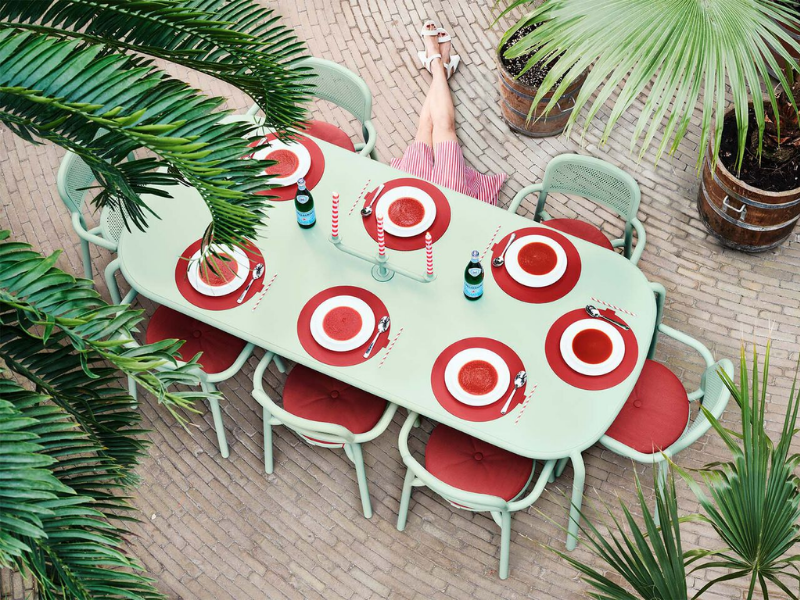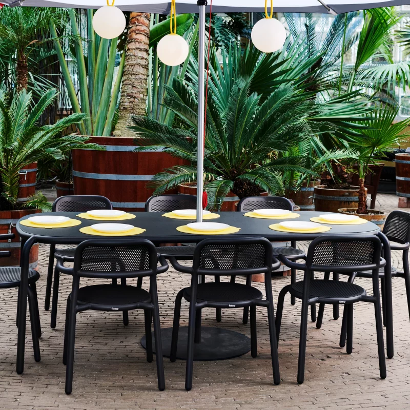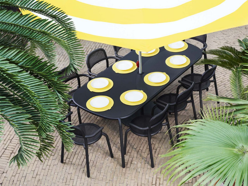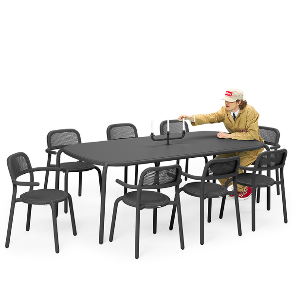 Toni Tablo桌子可容納八人一同使用,其中桌面中間的孔洞在白天時可以配合傘架、晚上還可以變成燭台使用