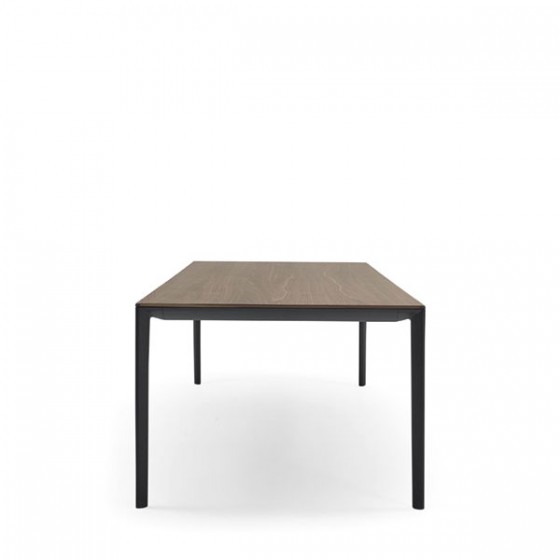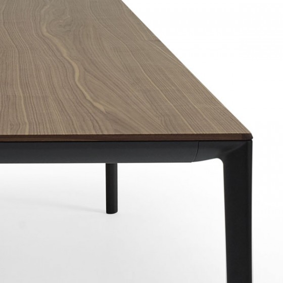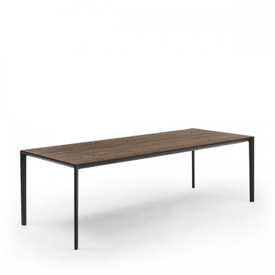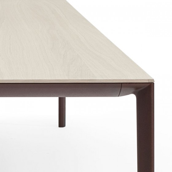 這是款充分展現極簡主義的纖薄桌子,實木貼皮與鋁製框架的完美搭配。桌面銜接處特別採用45度角的設計,更顯鋁製桌腳纖長細緻搭配其圓滑細緻的邊緣處理更顯摩登感。