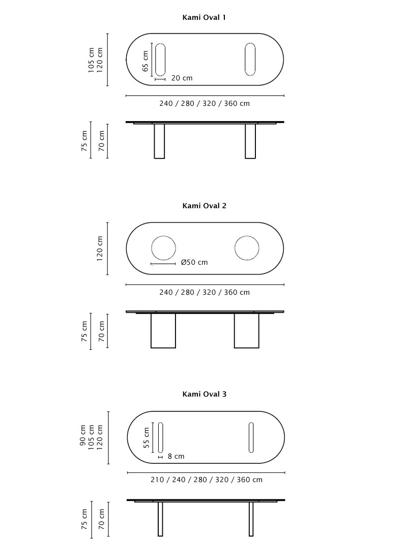 桌面兩端的半圓造型,使 Kami 更適合放置於空間中心,這使 Kami 很自然地成為空間中注目的焦點以及人們活動聚集的中心。像是懸浮於腳柱上的寬大桌面,使人在桌邊活動時動線流暢,不會被桌腳所侷限。