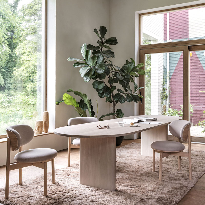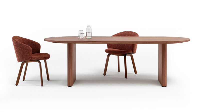 Kami 橢圓桌圓滑且溫潤的外型設計,具有多種腳座造型,適合各種場合使用。