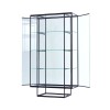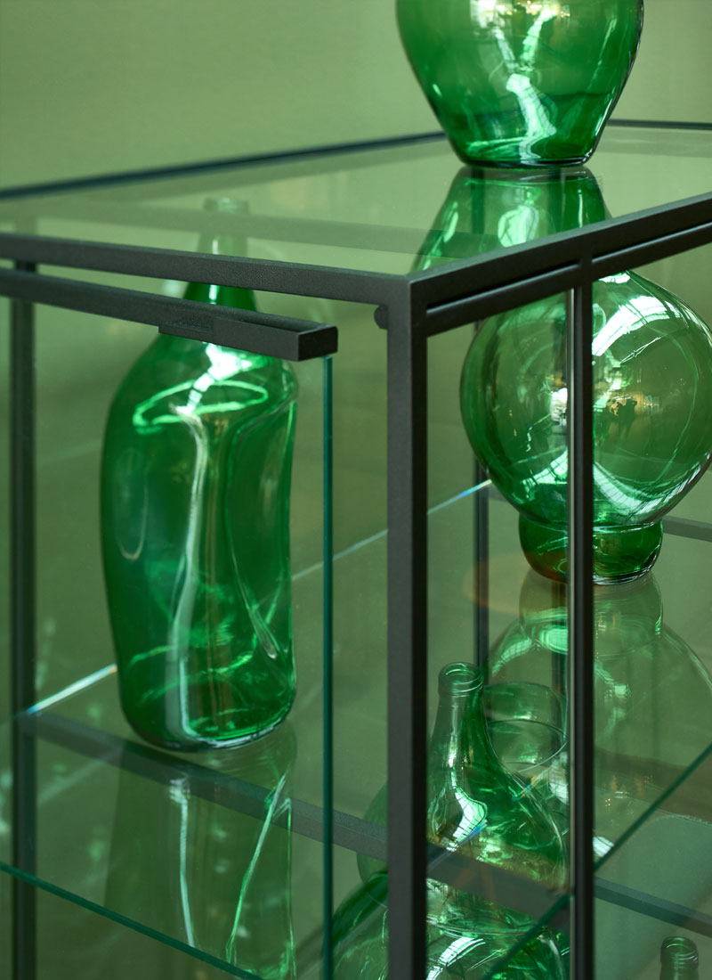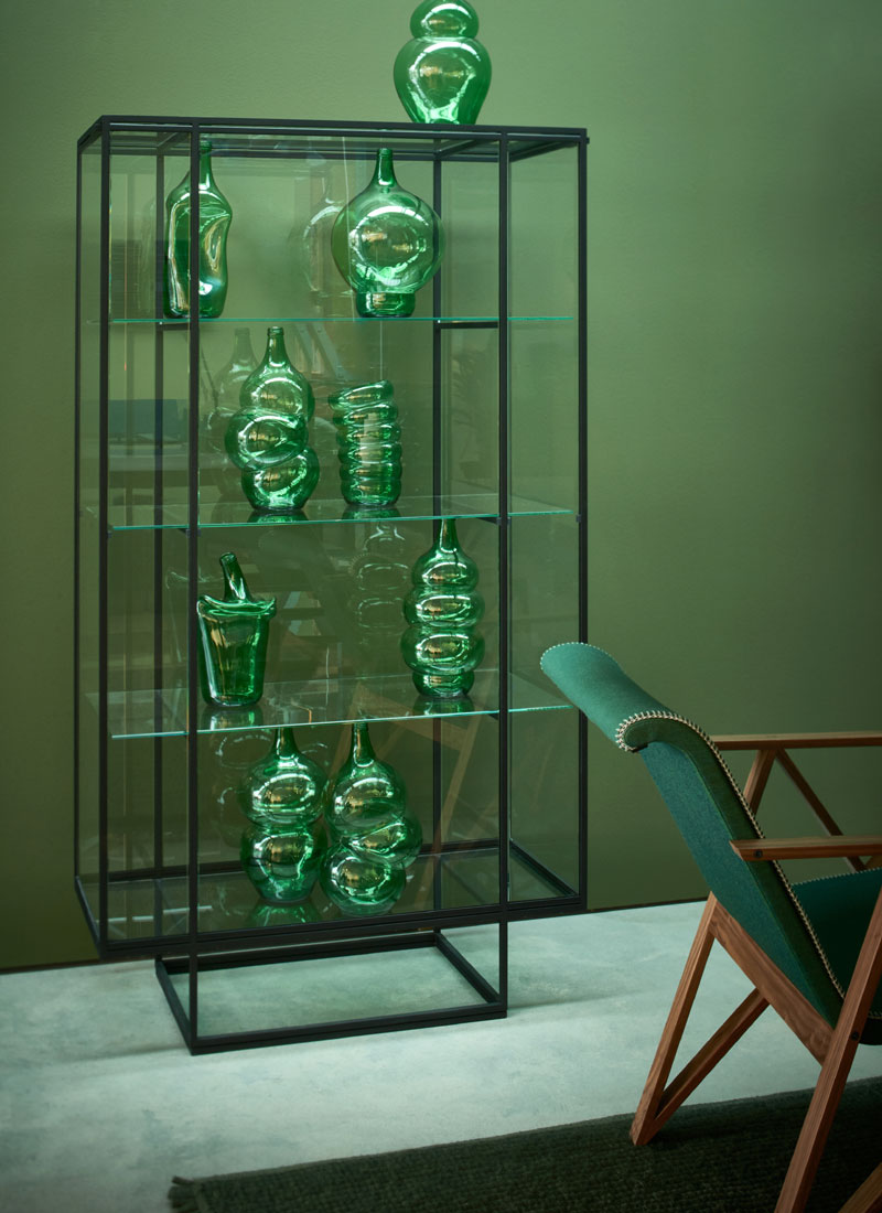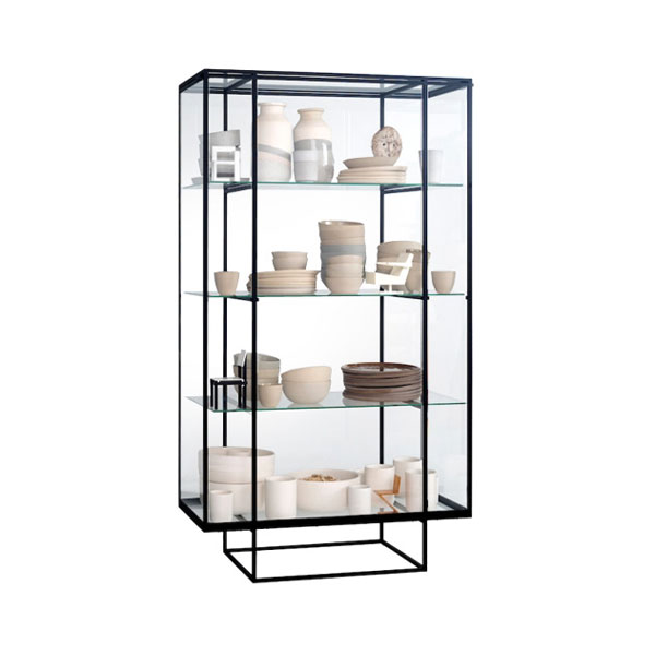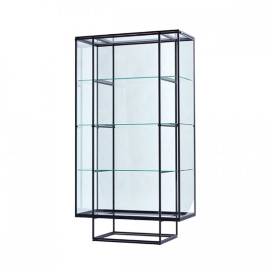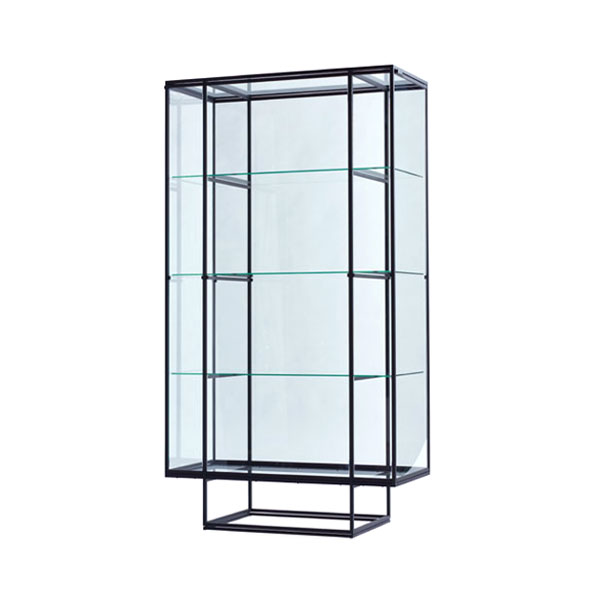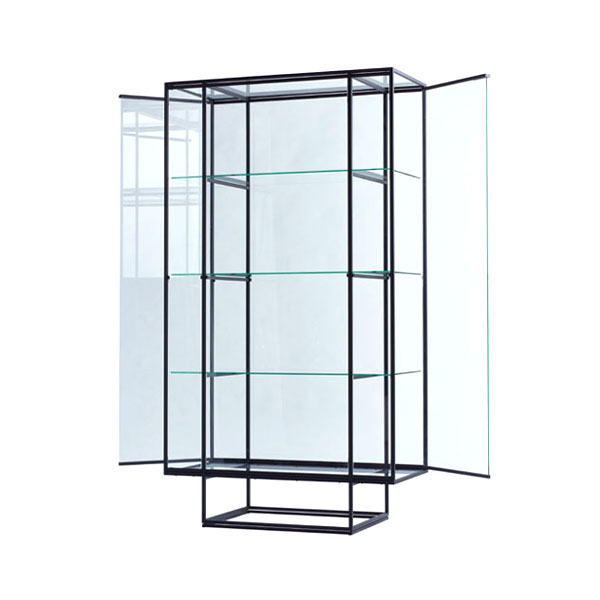 具有四層的空間配置,其展示櫃兩側皆有一個門板提供使用。可以選擇不同的外框顏色:黑色或灰褐色,搭配透明的玻璃平台。