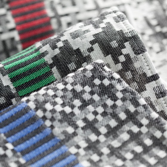 這些融合的成果以黑白圖形進行編排,但格外以紅色、藍色或綠色的條紋增加延伸在織物上。