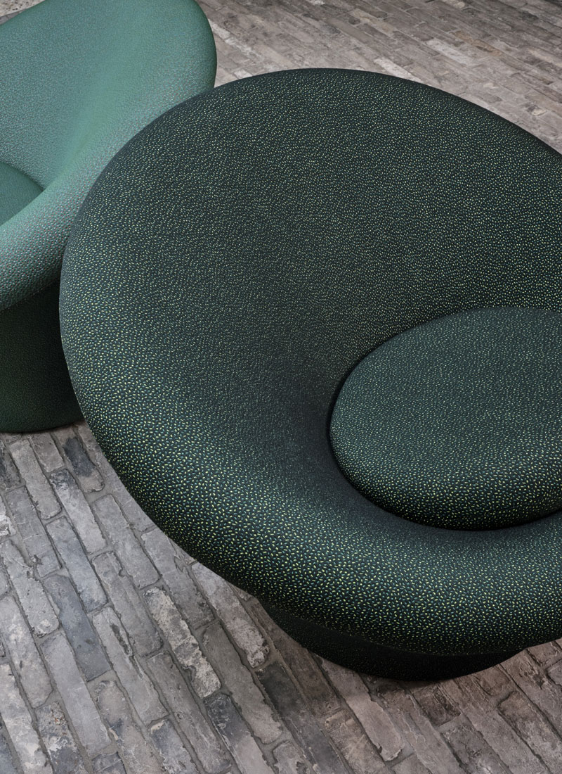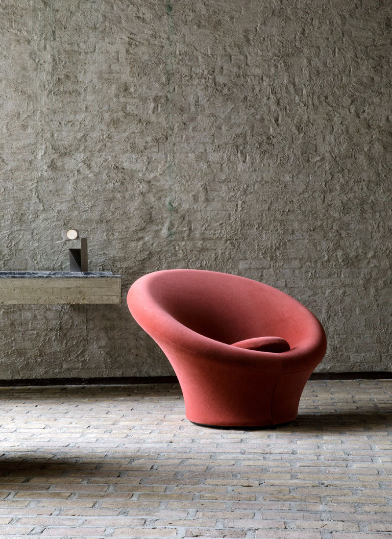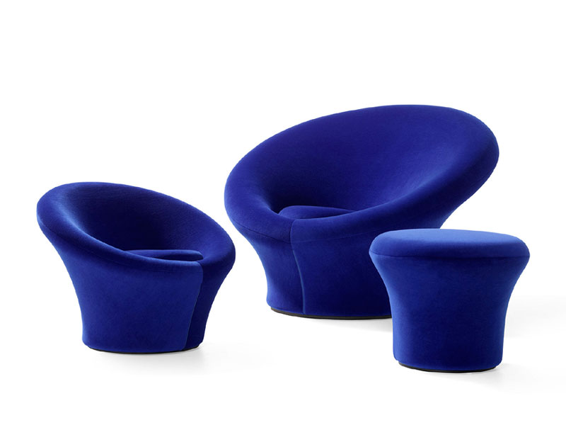 Mushroom休閒椅以其美麗的曲線及無縫的一體式彈性面料出名,這樣的設計靈感來自於設計師Pierre Paulin在觀察穿著泳衣塑形和被包裹的女性時發想而來。於1958年,開始與Artifort 的開發部門研究並開發了彈性織物罩。這樣的革命式製造技術與設計徹底改變了世界對於形式、材料和紡織品方面看待設計的方式。