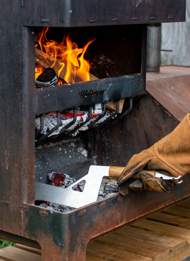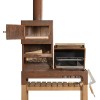 特別的雙層設計,因此讓煙霧可通過外箱(燒木材區)與內箱(食材區)達成全方位的熱源,也因有煙囪爐管的設計讓煙霧遠離火源散出,烤箱內的食物並不會與煙霧接觸,更不會影響到使用上的困擾及造成身體的不適。