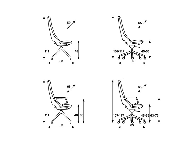 椅座則以多款布料或皮革提供選項。腳座可選擇:帶回位系統的四腳固定底座或五腳輪底座。可供選擇粉體烤漆色的鋁製扶手則為配件,為不同環境需求創造出最適合的高配飾度。